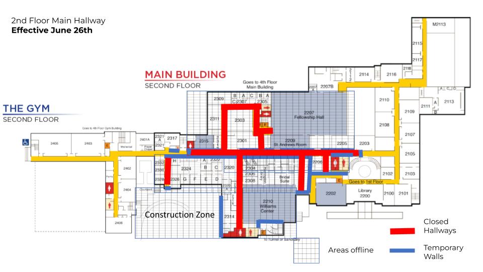 Beginning Monday, access to the main hallway on the 2nd floor will be closed between the Family Commons and Stairwell 12. In addition, there will be no access to the Williams Center. Please see below for closed hallways on the second floor.
